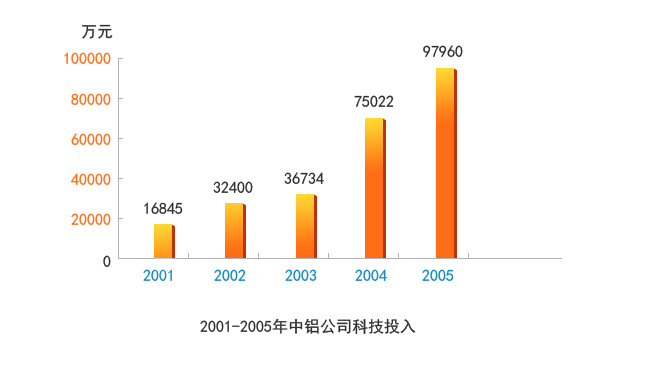 中国铝业公司以科学发展观为指导,坚持科技兴企战略,强化自主创新能力,加强知识产权保护,提升核心竞争能力,确保可持续发展。“十五“期间,公司共承担国家863、国家科技攻关等项目40余项,科技研发投入近30亿元,取得科技成果390项,获得国家科技奖6项,申请中国专利1053件,国外专利37件。