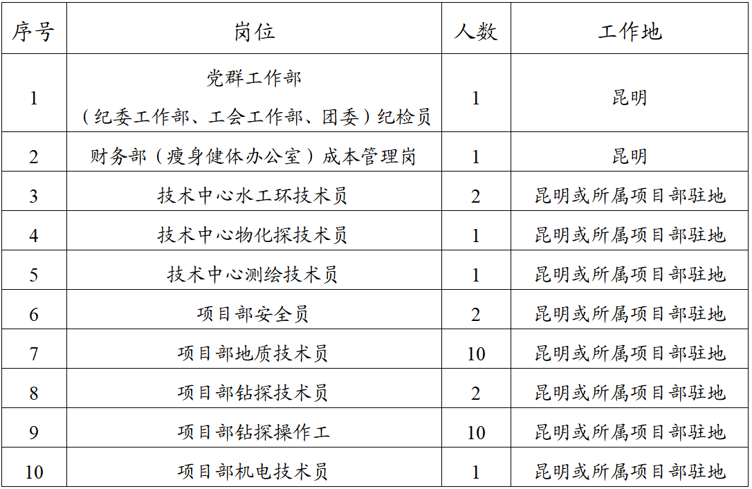 为了加强中铝(云南)勘查股份有限公司(以下简称公司)队伍建设,根据工作需要,经研究决定,面向bv伟德国际体育官方网站内部以竞争上岗方式产生地质技术员等各员工31名。现将有关事项公告如下: