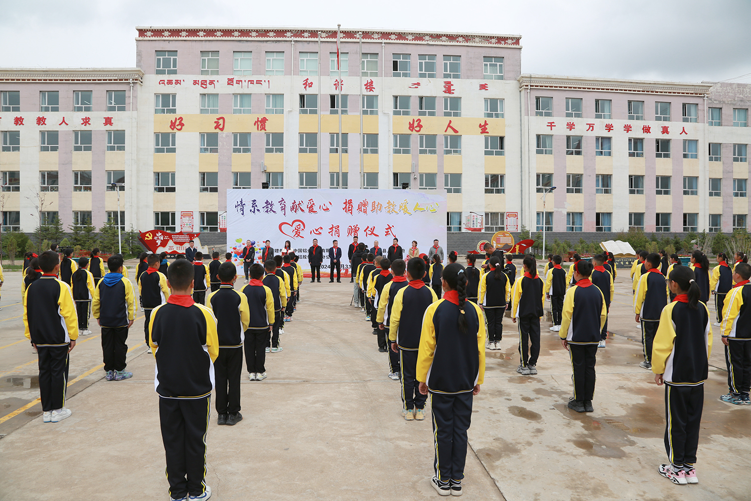 5月31日上午,海晏县民族寄宿制小学教学楼前小广场上,鲜艳的五星红旗迎风招展,满载崭新“绿色铝”课桌椅的卡车整齐排列在广场两侧。
