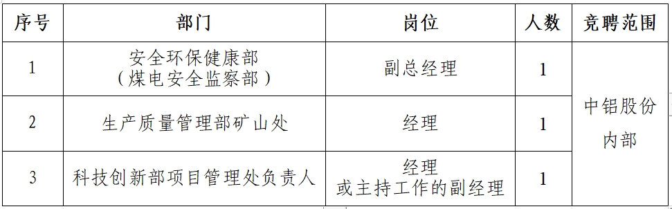 为打造经营能力和专业能力特强的经营单元本部,拟面向中铝股份内部以竞争上岗方式选拔中铝股份安全环保健康部副总经理1人,生产质量管理部矿山处经理1人,科技创新部项目管理处负责人1人。现就有关事宜公告如下: